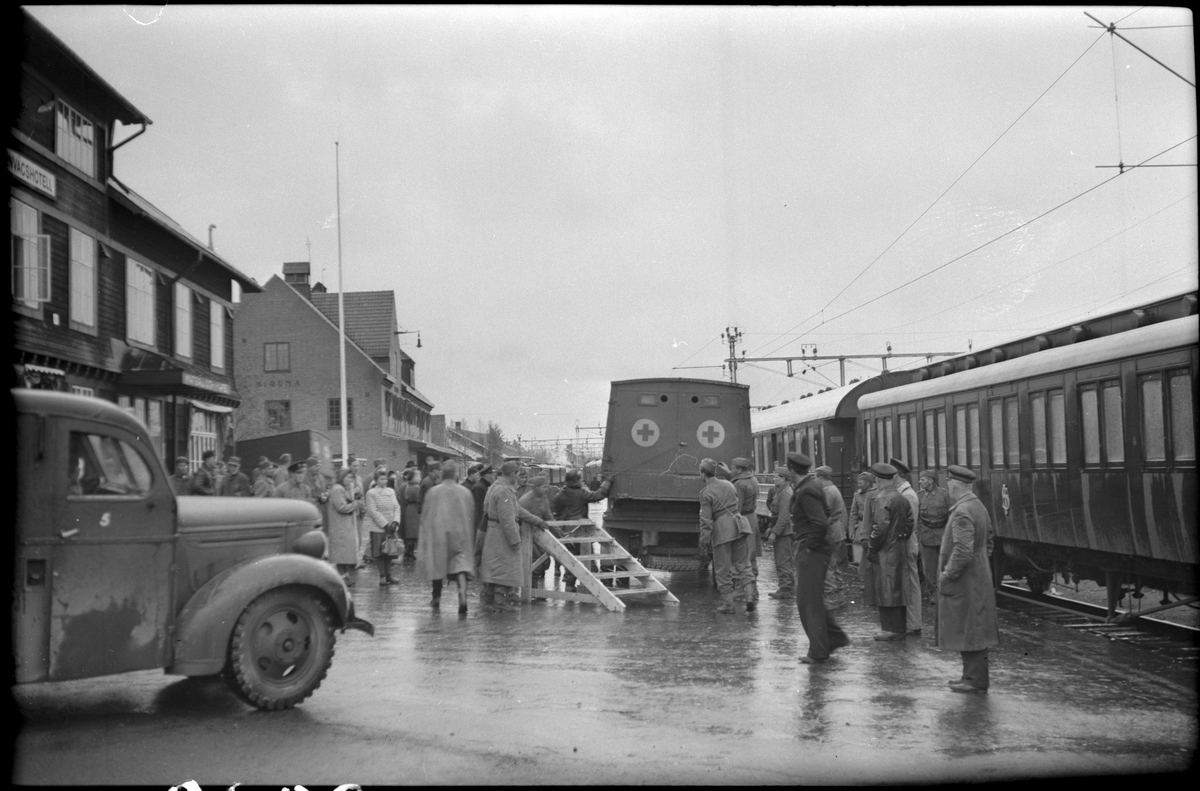 Under evakueringen av finska flyktingar, hösten 1944. Röda Korsets ambulans utanför Kiruna järnvägsstation.