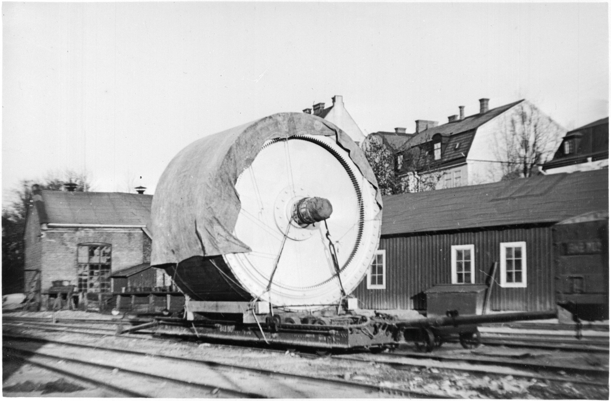 Överföringsvagn, BKB 987, lastas med tung maskindel. Inom SJ hade denna typ av överföringsvagn littera Q37. Till höger i bild skymtas en öppen godsvagn, BKB 702.