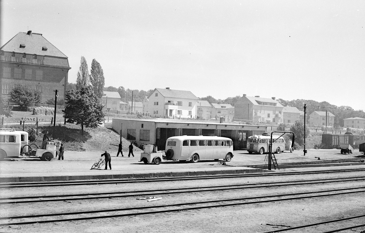 Gengasutrustade bussar, däribland BKB 23, registreringsnummer K 810, vid Ronneby bangård.