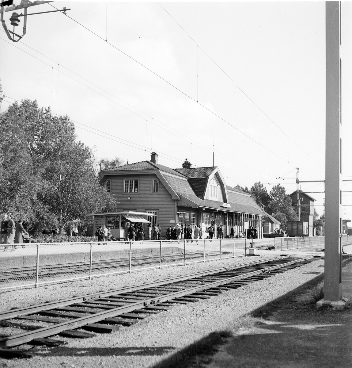 Titel: Bräcke järnvägsstation. Text på sidan av kiosken: Tidningar Böcker Vykort Pappersvaror.