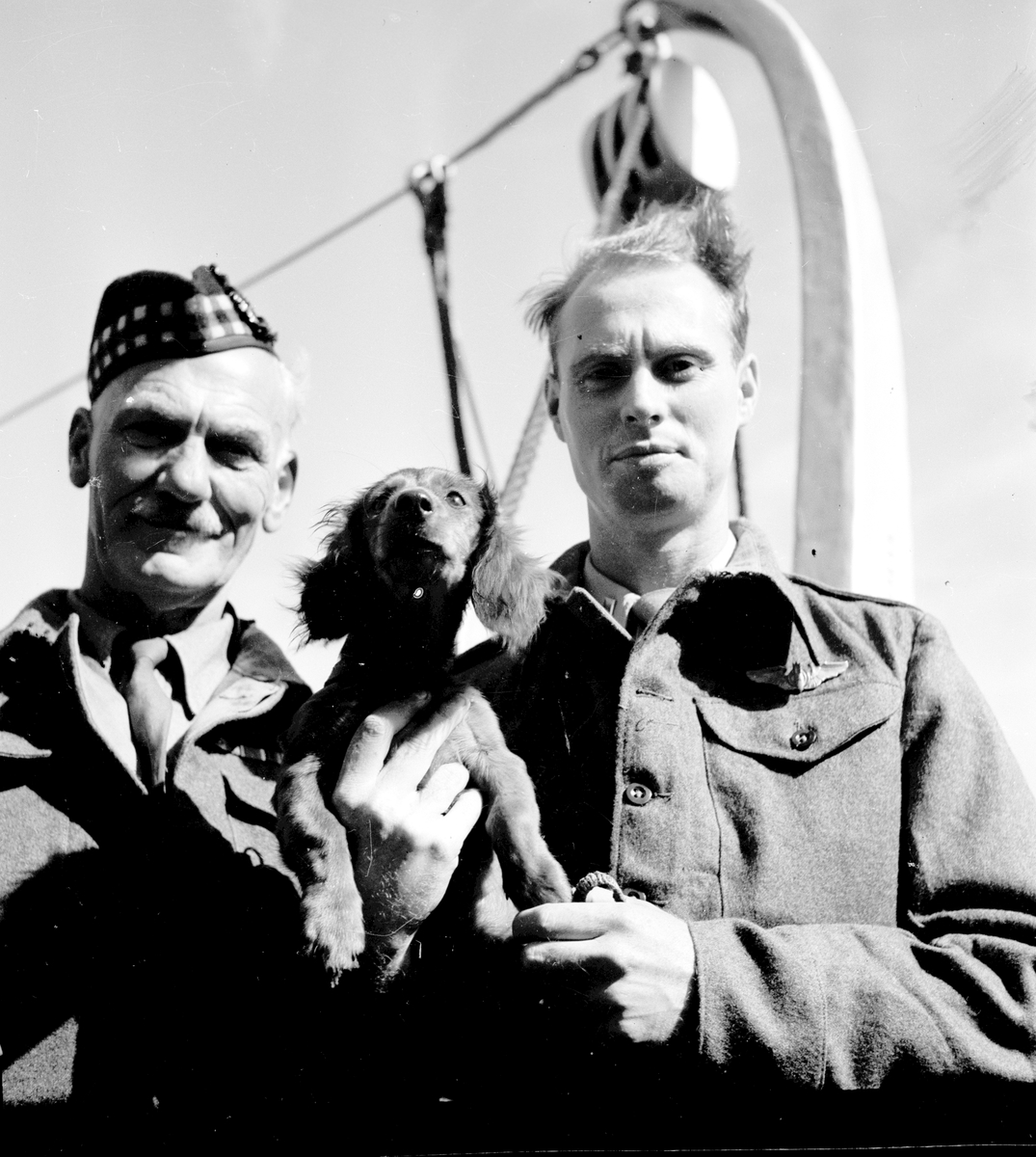 Titel: Krigsfångeutväxling i Trelleborg. En av männen bär en hund.