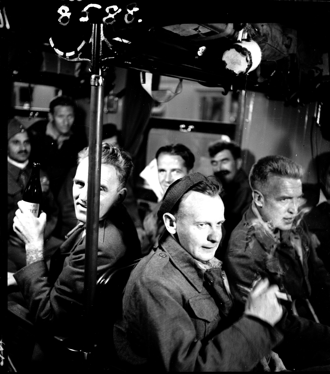 Titel: Krigsfångeutväxling i Trelleborg. Männen dricker pilsner och röker.
