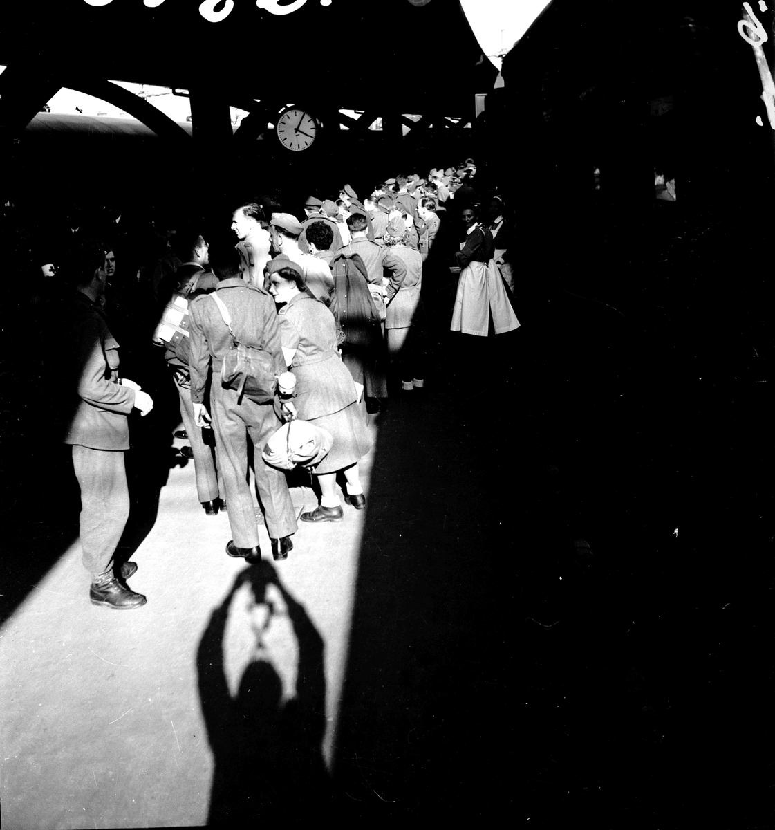 Krigsfångeutväxling i Trelleborg. Människor köar för att komma med tåget. Skugga av en man som fotograferar.