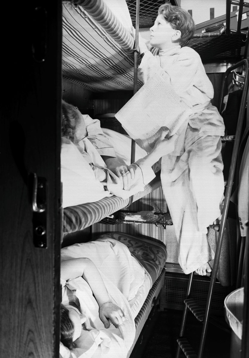 ABo2c, 3:e klass sovvagn. Mannen ligger och läser tidningen och flickan klättrar på stegen upp till övre slafen.