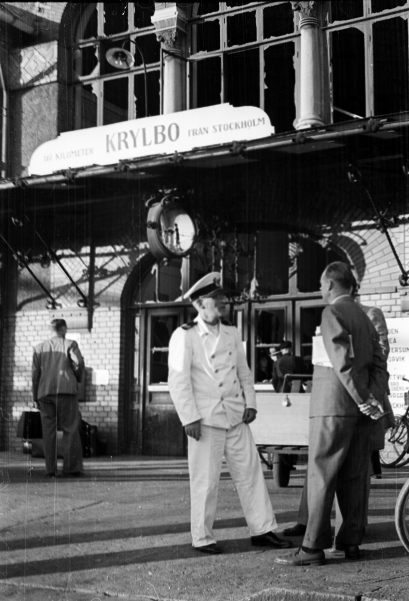 Titel: En man i uniform står och samtalar med två andra män. Aktuellt är Krylboolyckan.