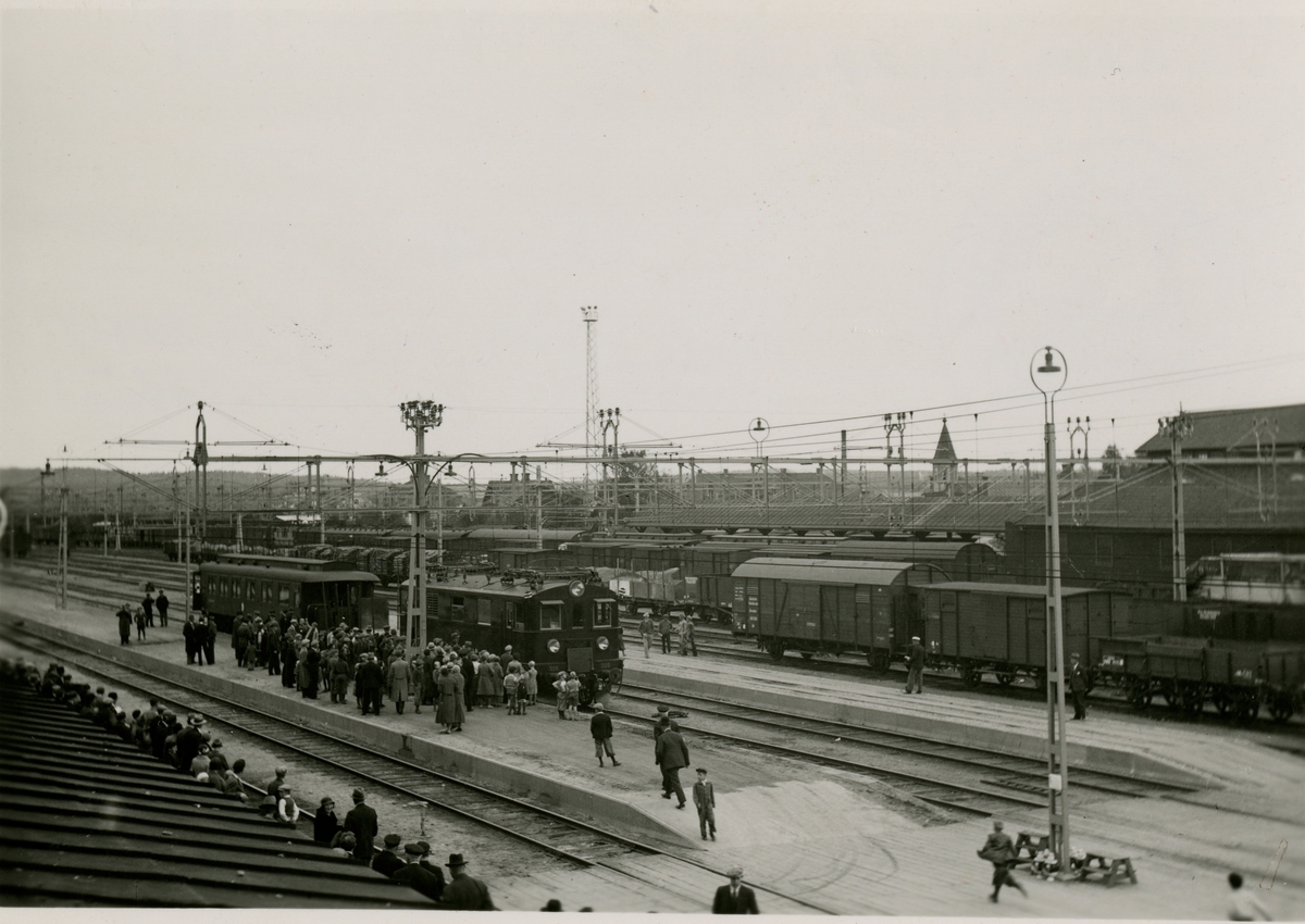 Första elektriska tåget ankommer Krylbo,nämligen provtåget från Hallsberg, lördagen 29/9 1934 klockan 14,30. Statens Järnvägar, SJ Ds 328.