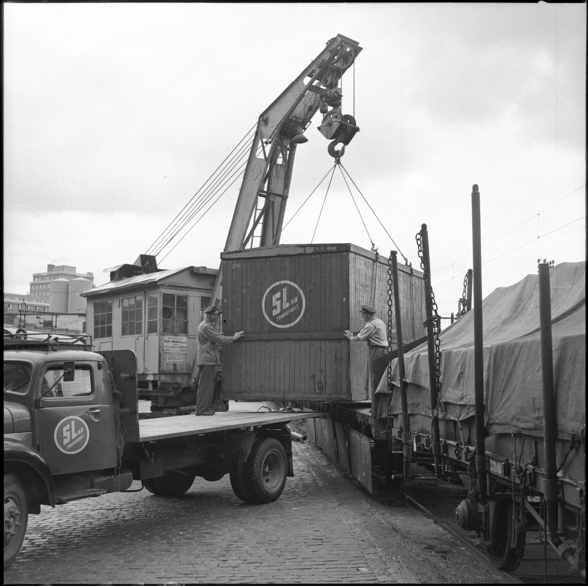 Ålderdomlig lyftkran lyfter SLAB flyttlåda, så kallad Lift.