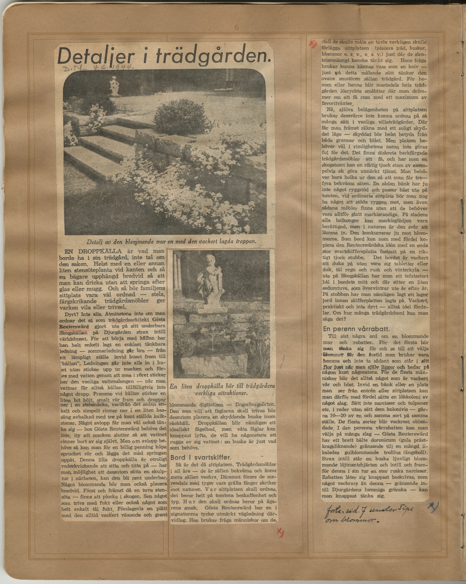 Tidningsklipp ur "Uppsatser om trädgårdar m.m. som på ett eller annat sätt beröra Gösta Reuterswärd. Samlade av Ernst Hj."