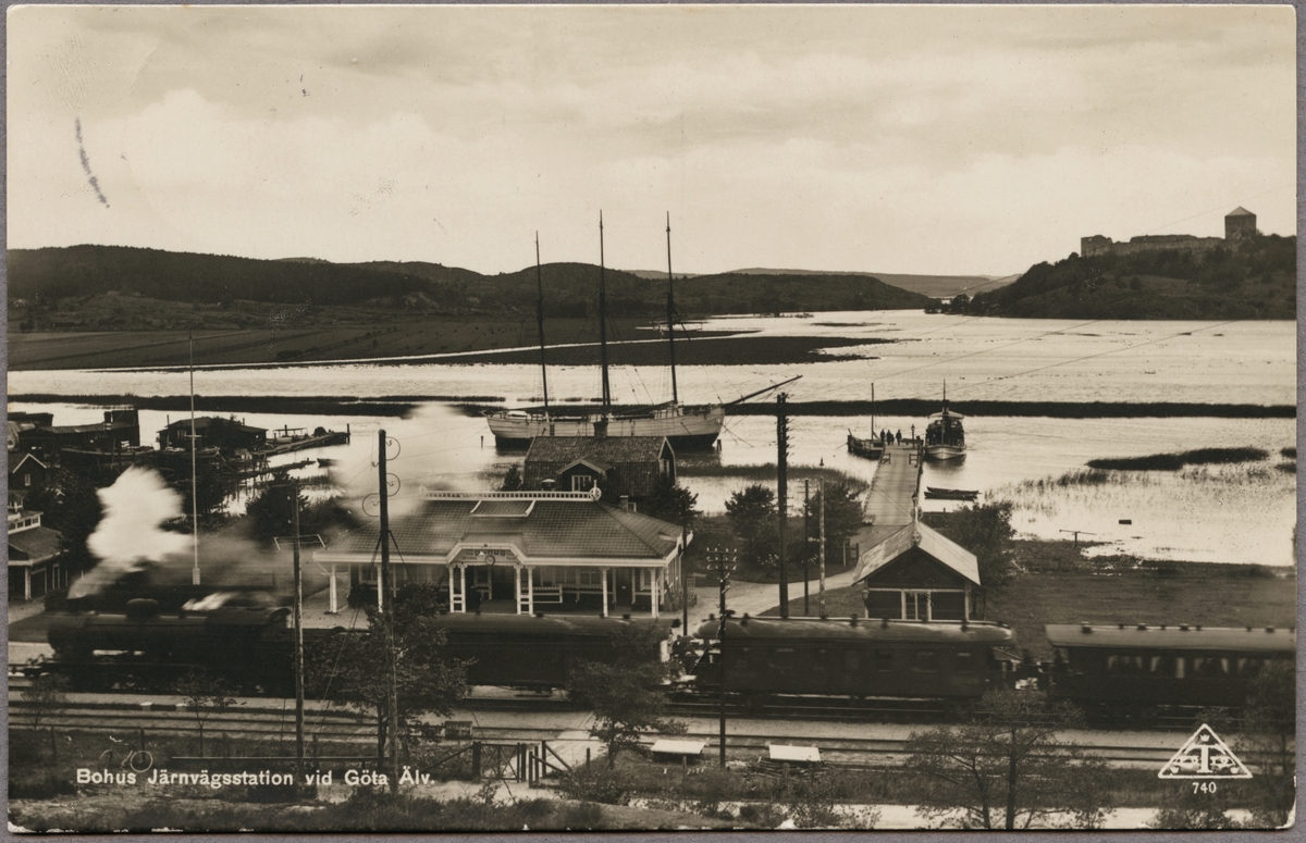 Vy på stationsområde och brygga för fartyg samt med Bohus Fästning i bakgrunden.
