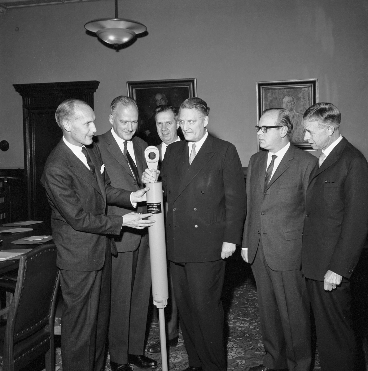 Miljonte bromsregulatorn. Gåva till Statens Järnvägar. Generaldirektör Erik Upmark tar emot.