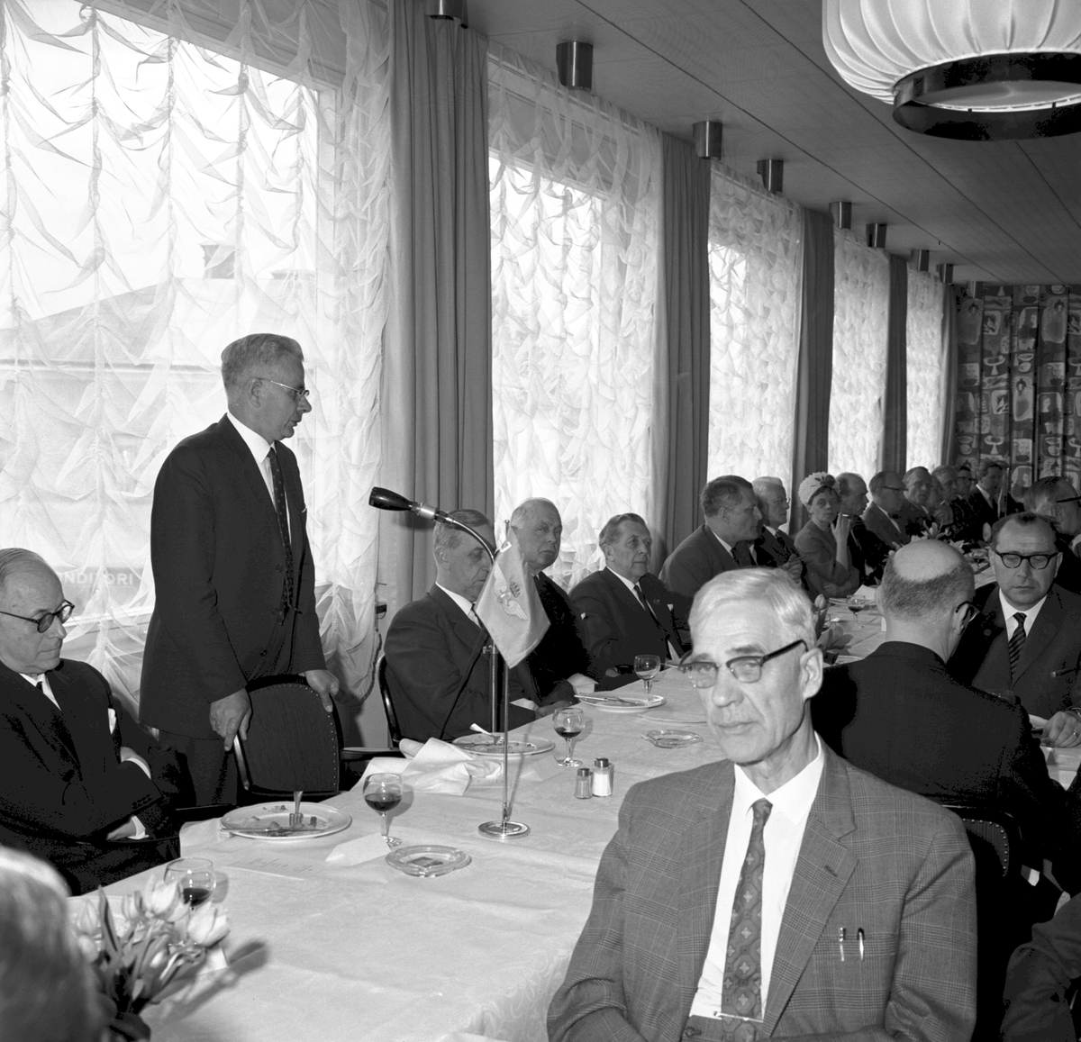 Elektrifiering av sträckan Borås-Alvesta. Generaldirektör, Gd, Erik Upmark, 6:a från vänster i fönsterraden. Kommunikationsminister, Gösta Skoglund, 5:a från vänster i fönsterraden