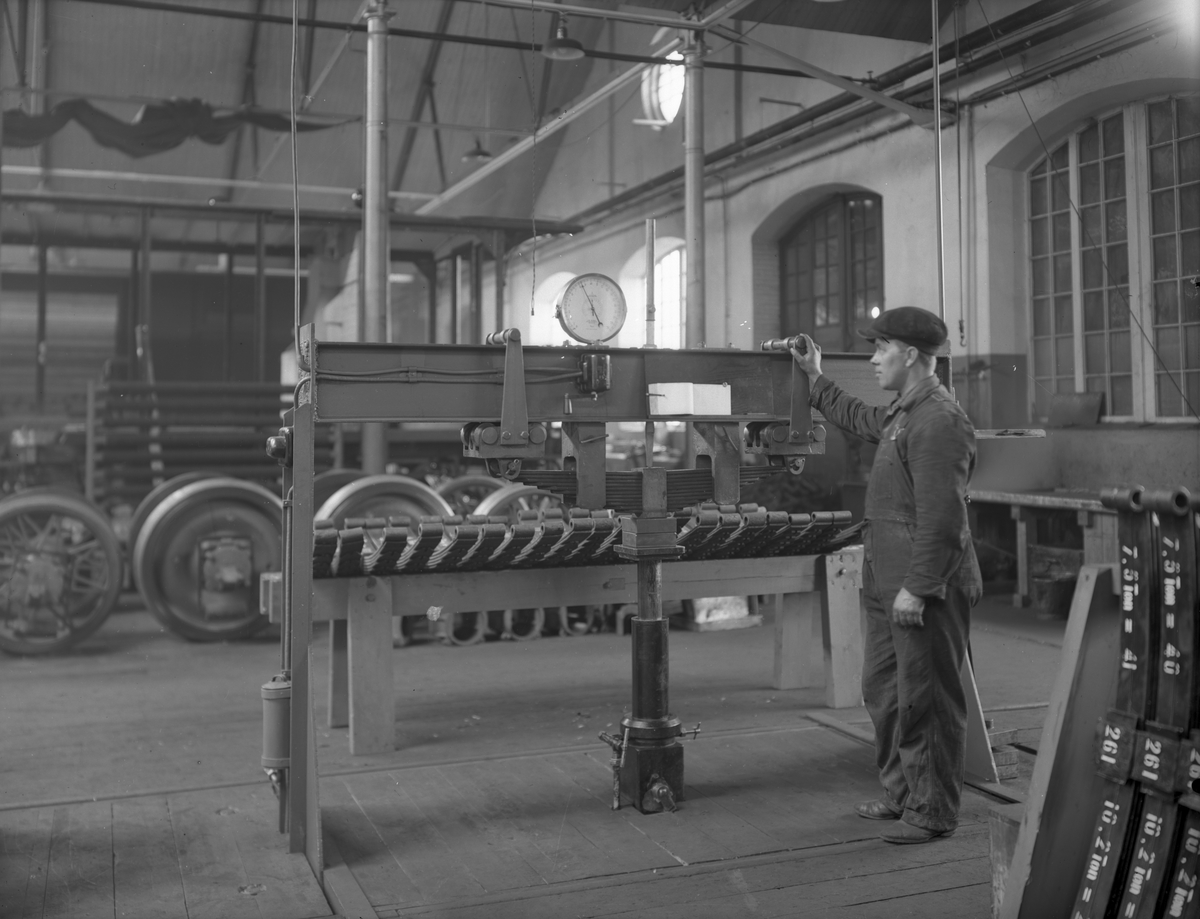 Titel: Verkstadsinteriör Anordning för fjäderprovning