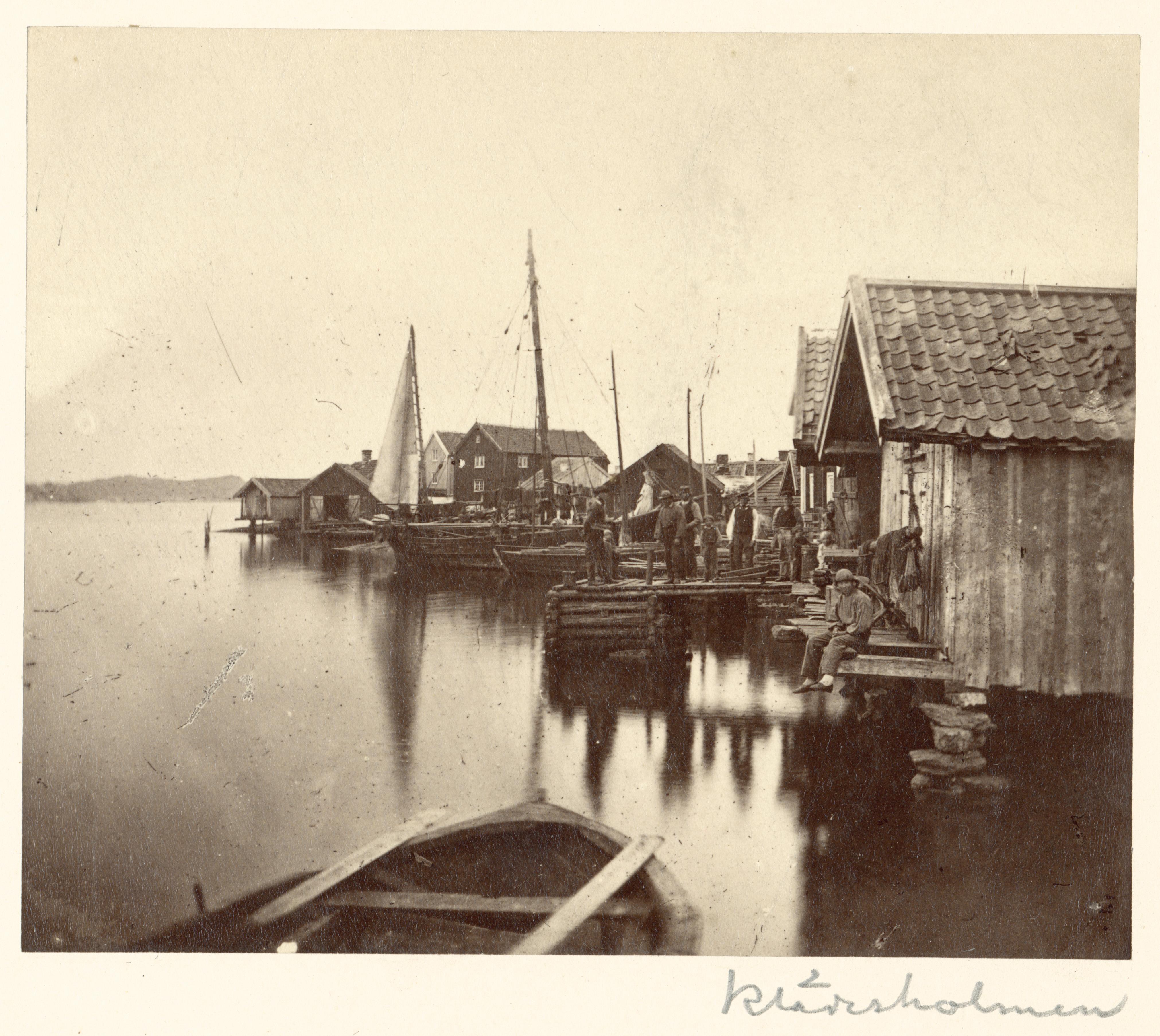 Båthus och bryggor vid fiskeläget. Bilden troligen tagen 1862.