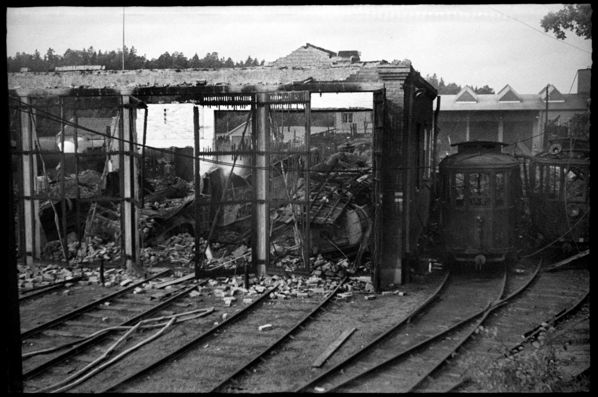 Ödeläggelse av vagnhall och fordon efter branden på Aga industriområde 1949-09-19, i Lidingö. Till höger i bild Stockholm - Södra Lidingöns Järnväg, SSLidj spårvagn 24.