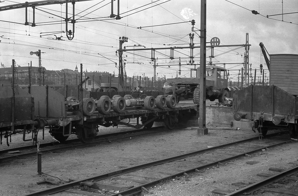 Titel: Vagnbjörn lastas av med hjälp av en AEC Matador som dragfordon.