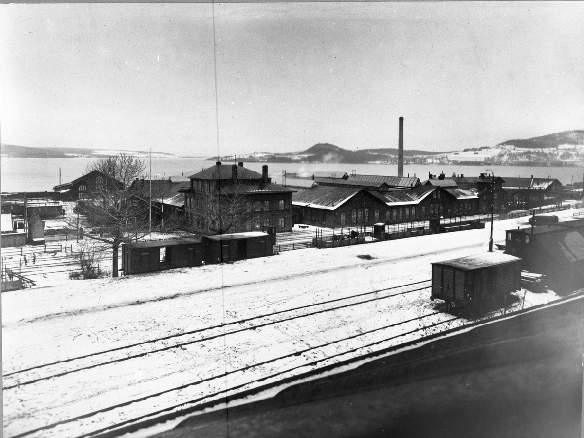 Titel: Huvudverkstaden. SJ vagnverkstad i Östersund 1906. Den första lok- och vagnverkstaden i Östersund togs i bruk 1882. Utbyggnader gjordes 1892 och 1898. En större utbyggnad gjordes och den togs i bruk 1906. Framför allt var det vagnverkstaden som blev betydligt större genom den senaste utbyggnaden. Verkstäderna låg i anslutning till lokstallet vid bangårdens östra ände.