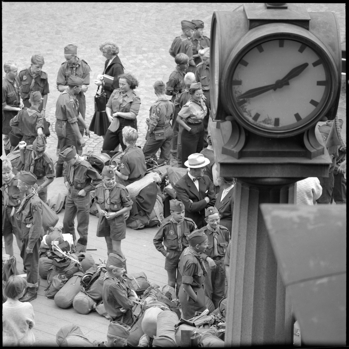 Scouter, samlade på gatusidan av Stockholm Central vid klockan framför huvudingången.