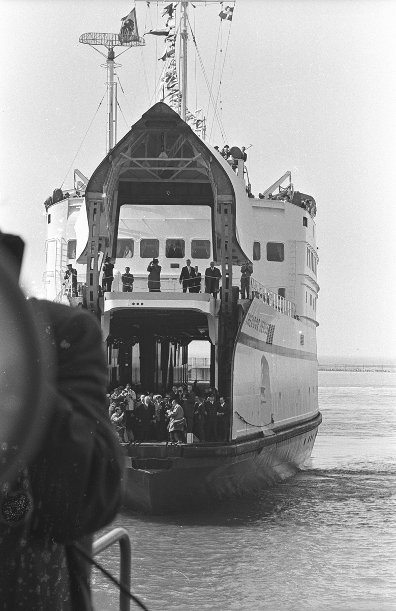 BogvisirInvigning av "Fågelvägslinjen" mellan Rodbyhavn, Lolland, Danmark och Puttgarden, Fehmarn, Tyskland. Den nya färjelinjen kallas "Fågelvägslinjen", på danska Fugleflugtslinien och på tyska Vogelflugslinie, eftersom linjen följer flyttfåglarnas flygrutt. M/S Theodor Heuss Puttgarden