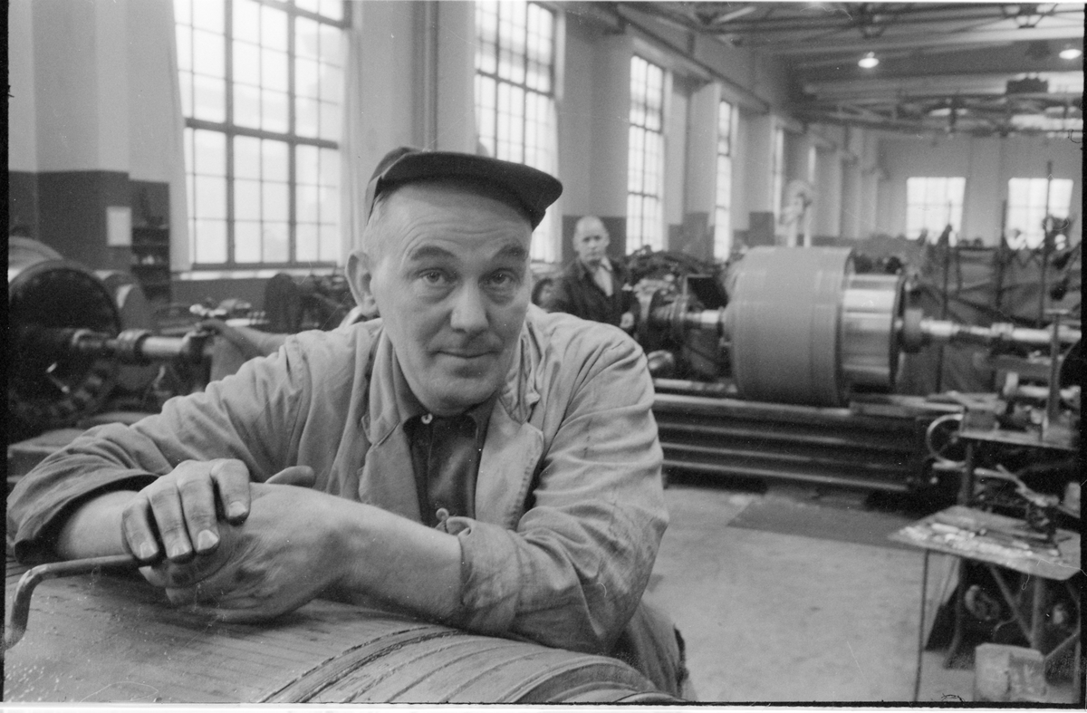 Verkstadsarbetare. I bakgrunden syns en hjulsvarv.