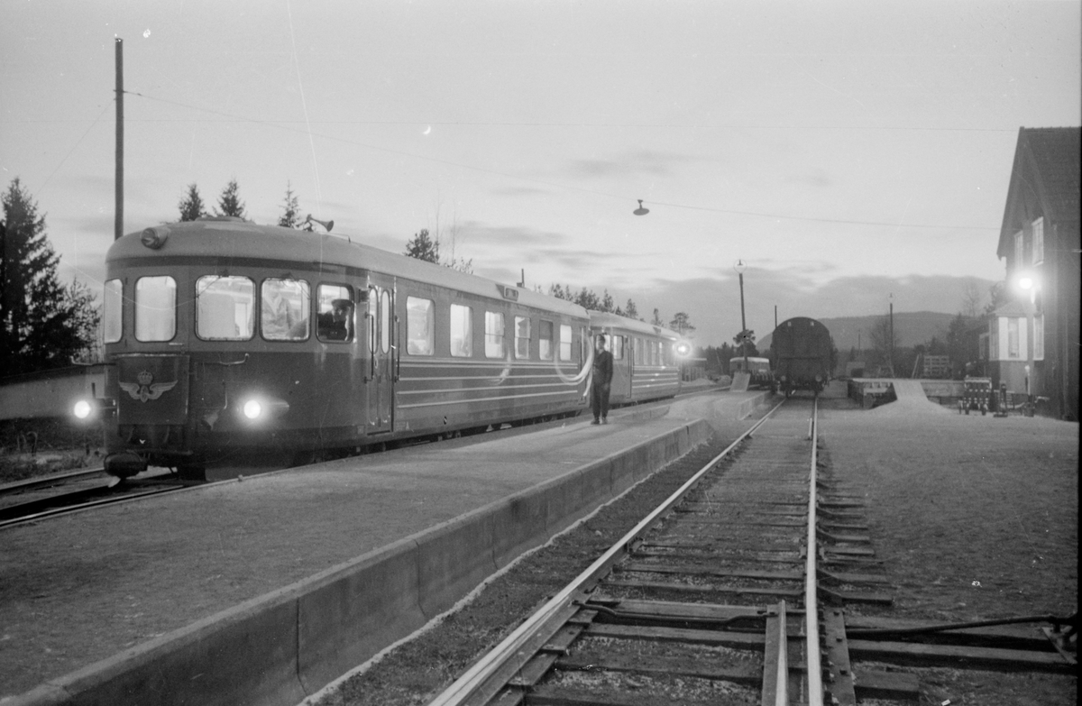 Rälsbusståg i kvällsbelysning.