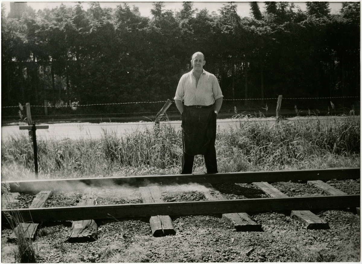 Spånga - Lövsta Järnväg, SLJ Brandchefen,handelsträdgårdsmästare Sven Karlsson, vaktar eldsvådan i spåret så att den inte skall slockna innan brandmannen Jakobsson hinner anlända med brandatrialjer.1956-06-06.Texten på baksidan av fotografiet.