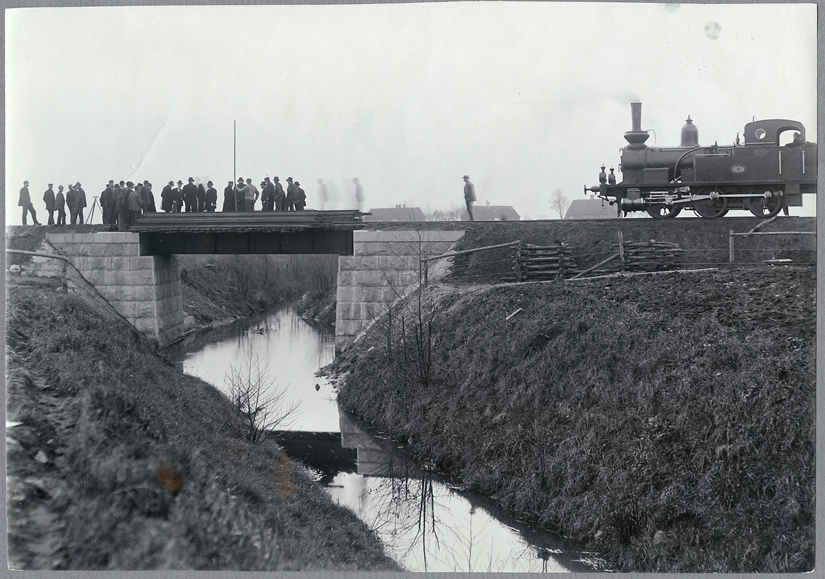 Mätning och inspektion av bro över å. Skåne-Småland Järnväg, SSJ lok 5. Loket tillverkades av Helsingborgs Mekaniska Verkstad 1897 med tillverkningsnummer 8.