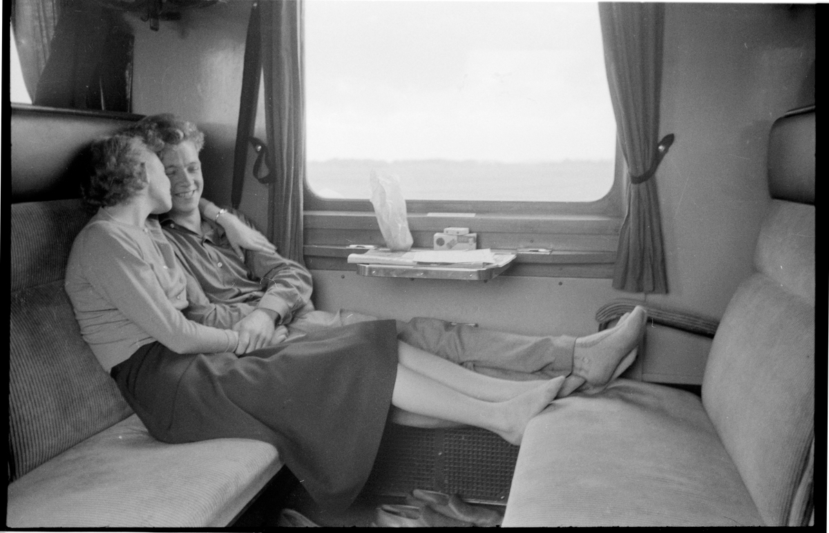 Titel: Statens Järnvägar, SJ personvagn med tågresenärer.