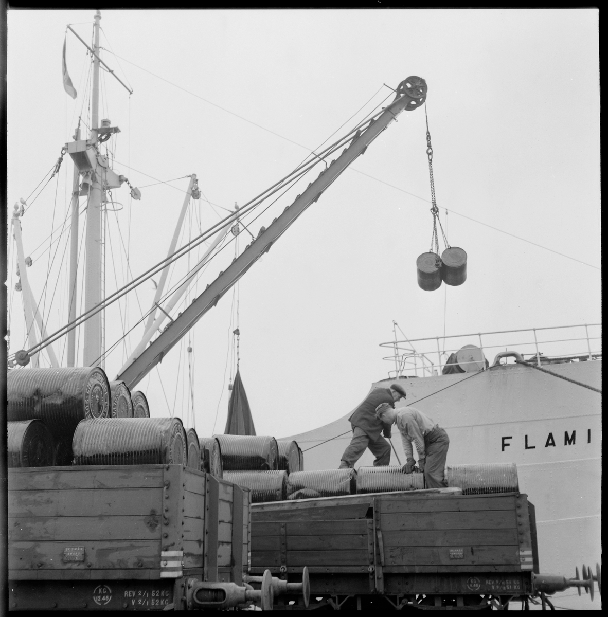 Lastning av tunnor i hamnen mellan Fartyget Flamingo och TGOJ-vagnar.