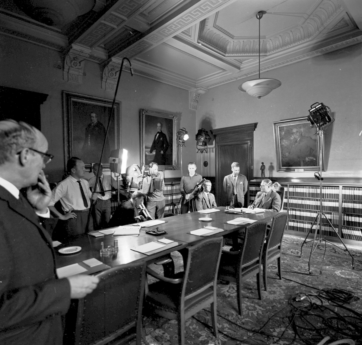 Personen vid bordets kortsida är generaldirektör Erik Upmark.