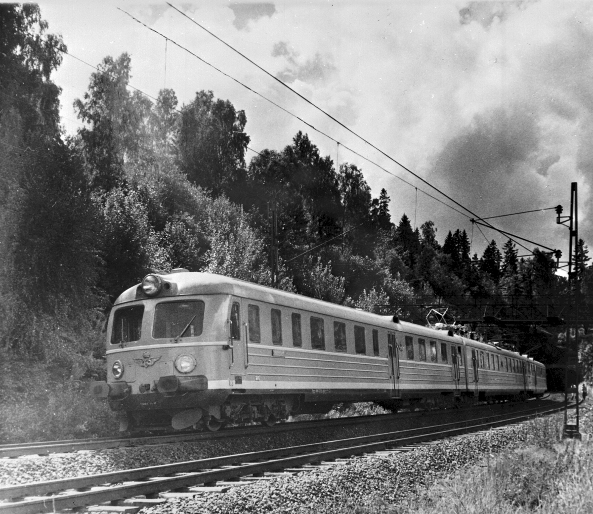 Statens Järnvägar, SJ Xoa5. Motorvagnståg, linjen Ctockholm -Ses. Tunnel i bakgrunden, alltså är bilden tagen vid Tullinge eller Rönninge. Xoa5 hade högsta hastighet av 94km/h och blev Sveriges snabbaste tåg på helsträcka. I drift fram till mitten av 1980-talet.