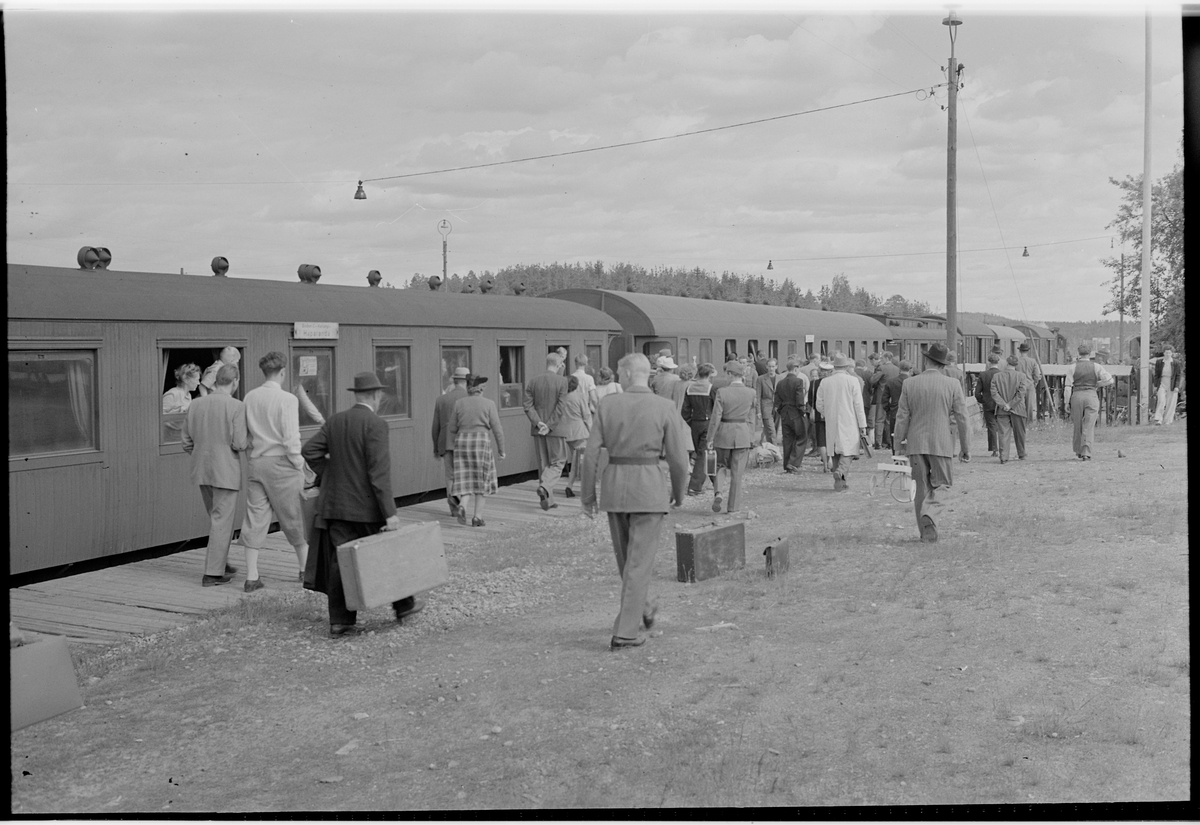 Persontåg vid järnvägsstation.