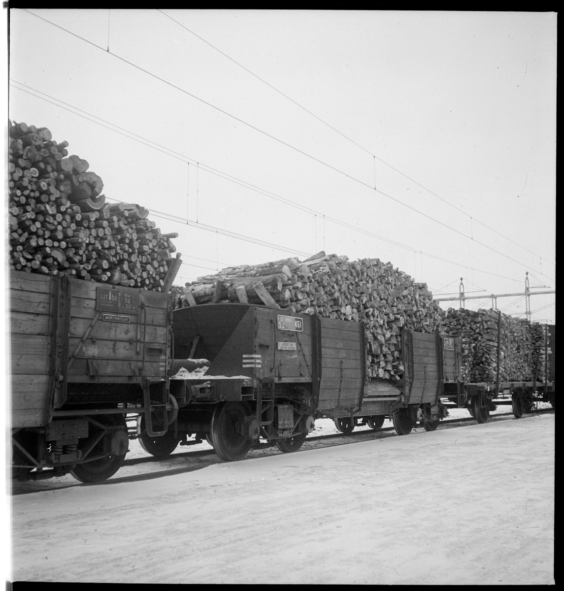 Lastade godsvagnar på bangård. Godsvagnen i mitten är Statens Järnvägar, SJ BYCF 451.