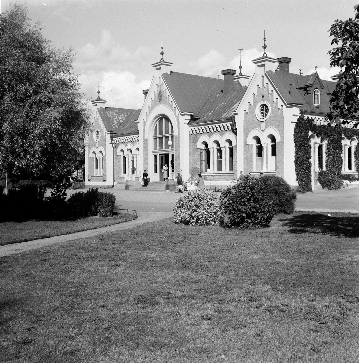Titel: Hudiksvall järnvägsstation sedd från gatusidan.