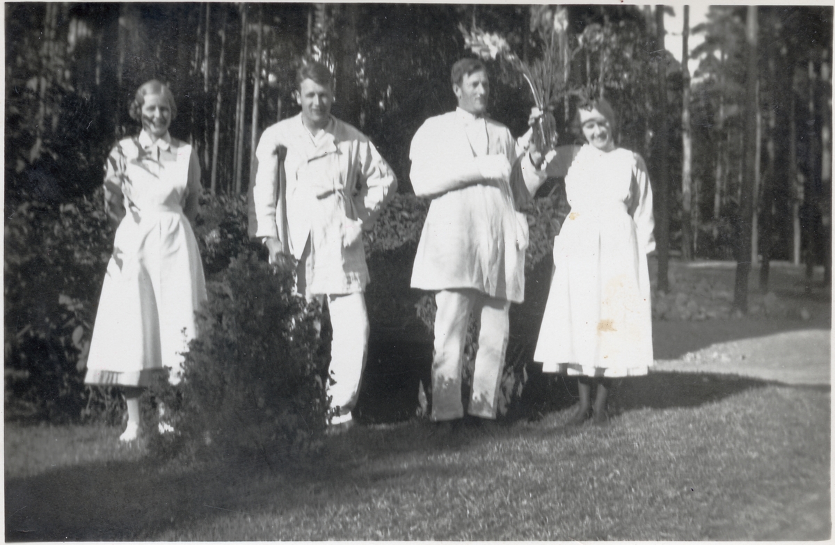 En okänd sjuksköterska på varje sida. Man nummer två från vänster är Per Erik Andersson.