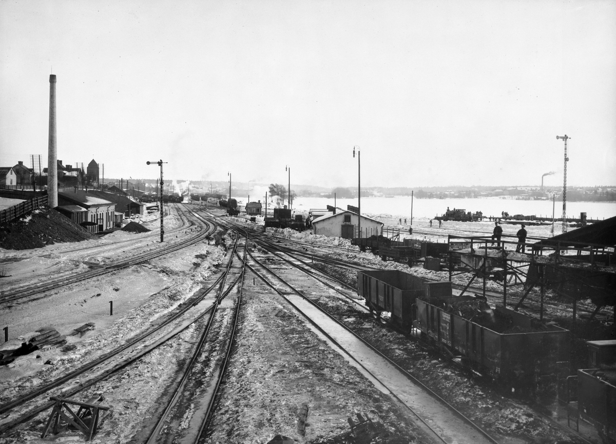 Titel: Nässjö bangård. Huset med skorstenen till vänster är SJ gasverk.