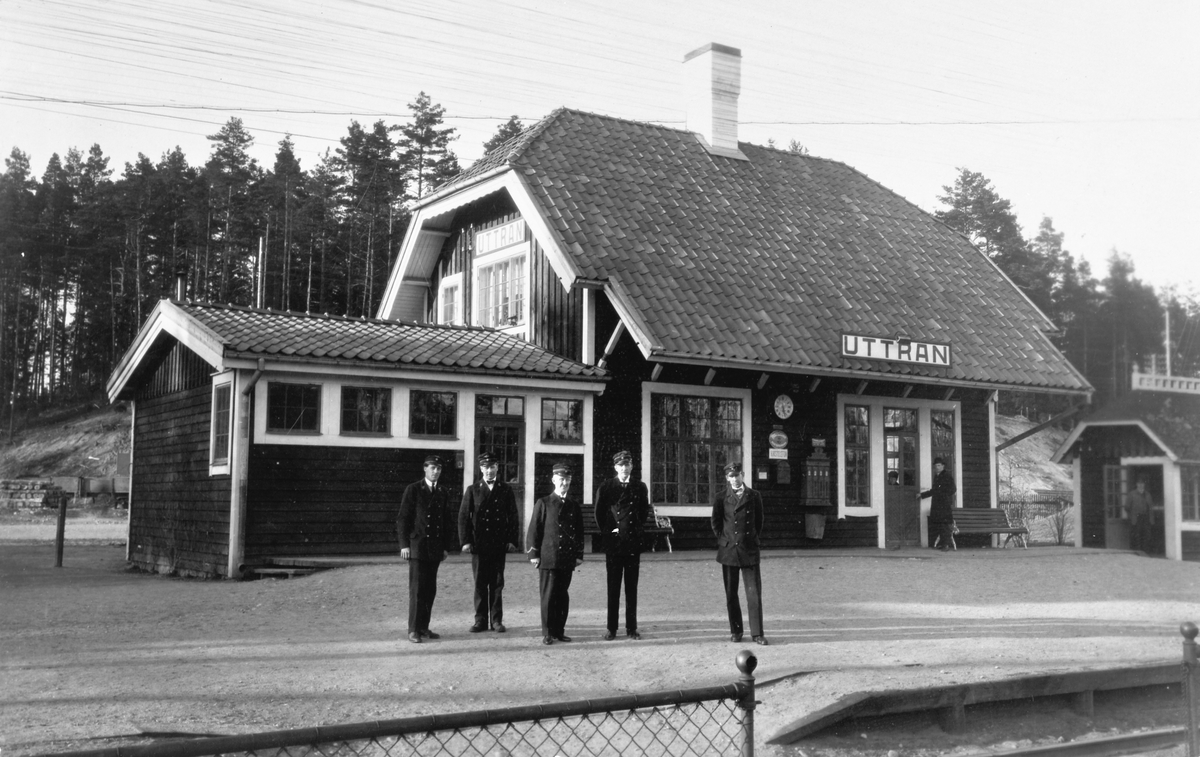 Titel: Uttran stationshus med personal framför.
