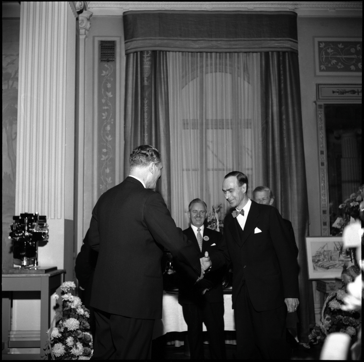 Generaldirektör Erik Upmark tar emot uppvaktande deputationer från Generaldirektör Rusck, Vattenfallstyr. Generaldirektör Sterky, Telestyrelsen i Kungliga vänthallen.