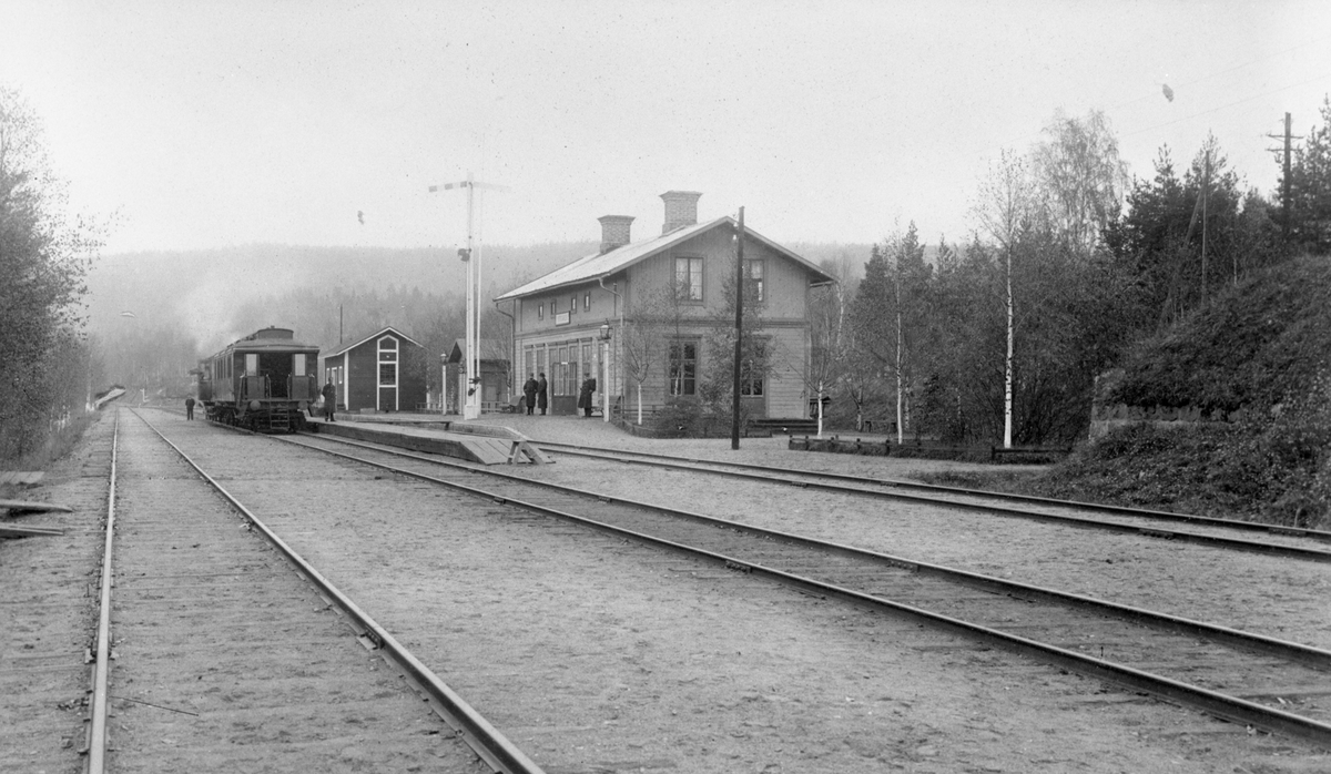 Titel: Bergsgården stationshus med persontåg vid plattform.