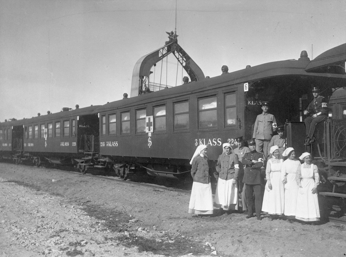 Sjukvårdspersonal på ett av de invalidtransporttåg som gick mellan Trelleborg och Haparanda under första Världskriget.