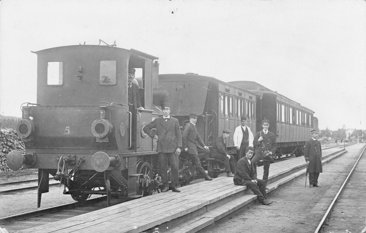BHJ , Borås - Herrljunga Järnväg , BHJ lok 5 med tåg bestående av vagn nr 3, 19 samt sommarvagn, här vif Fristad station.
