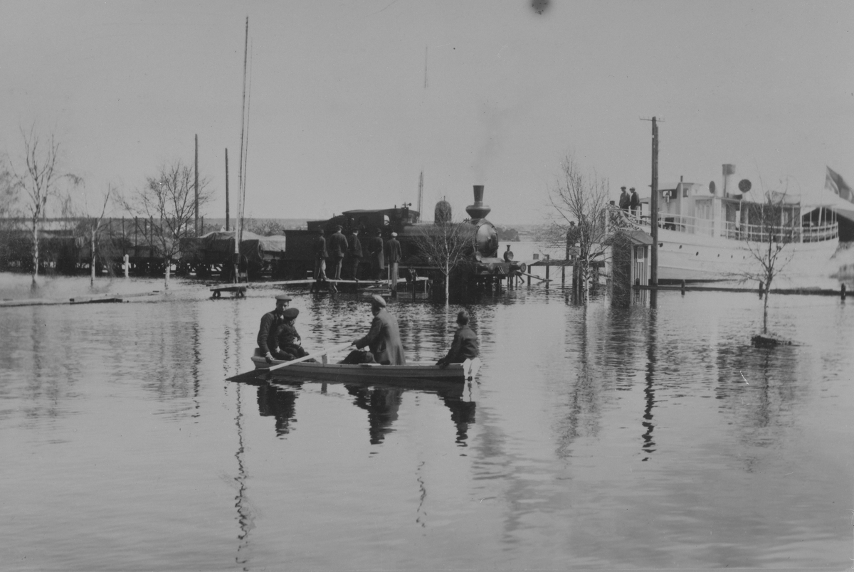 Mora - Vänerns Järnväg, MVJ, godståg och ångfartyget Engelbrekt vid Saxviken.