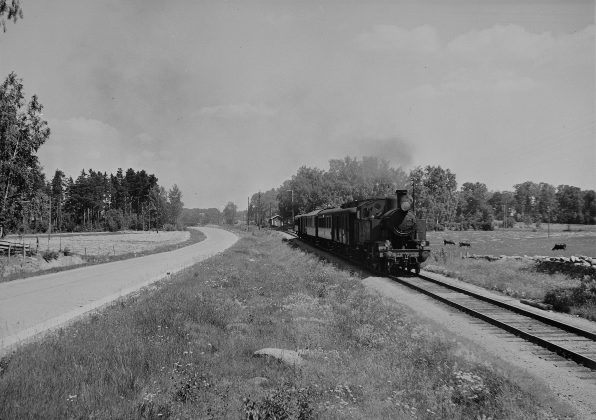 Tfv Grängesberg - Oxelösunds Järnväg, TGOJ lok 54 med persontåg vid utfarten från Valskog på väg mot Arboga.