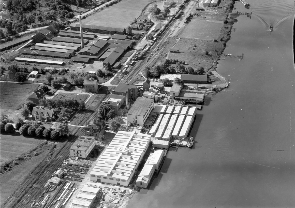 Flygbild över fabriksområde i Agnesberg. Upptill i bild skymtas järnvägsstationen.