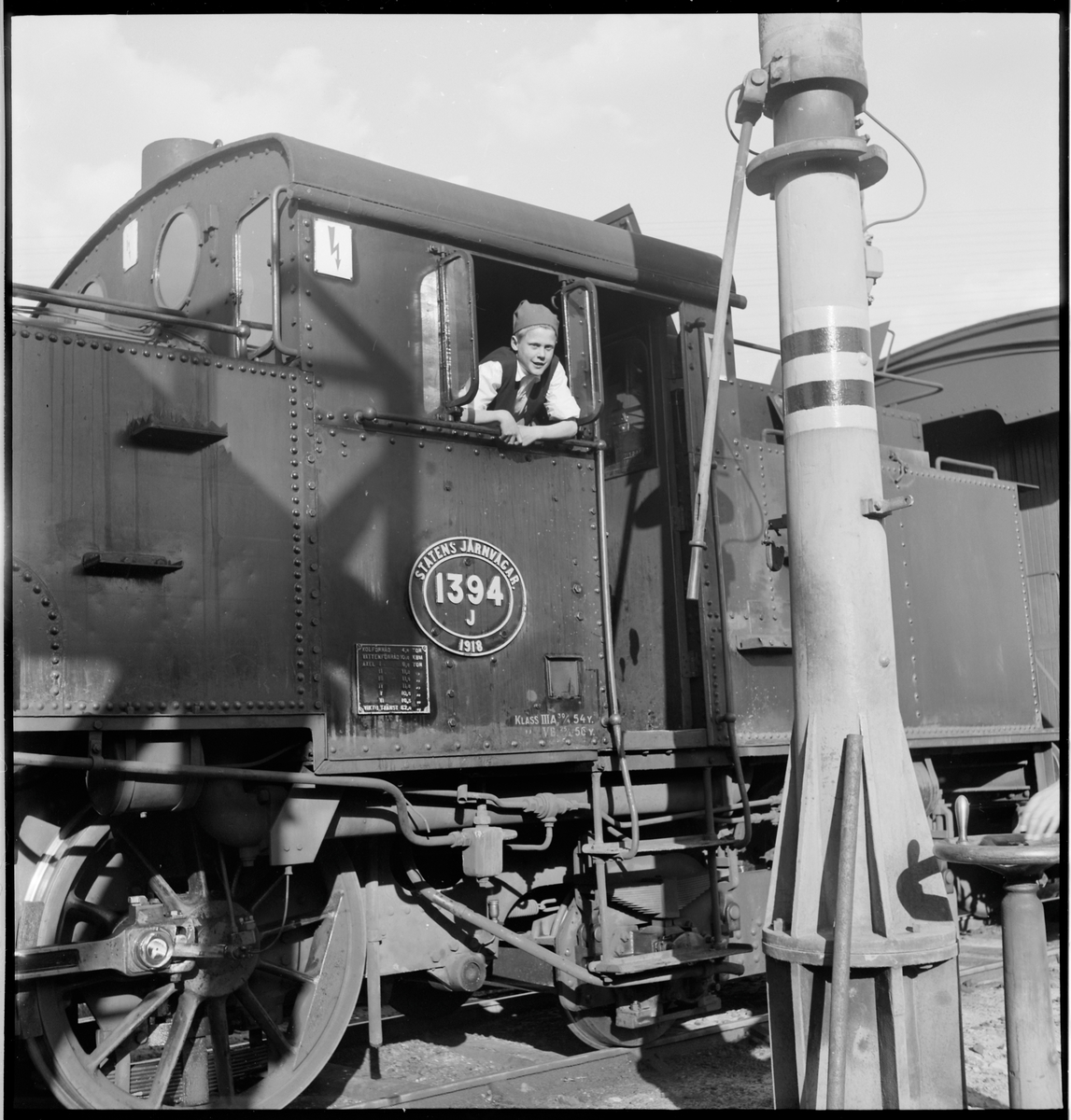Alf Larsson som Nils Holgersson på ångloket Statens Järnvägar, SJ J 1394.
