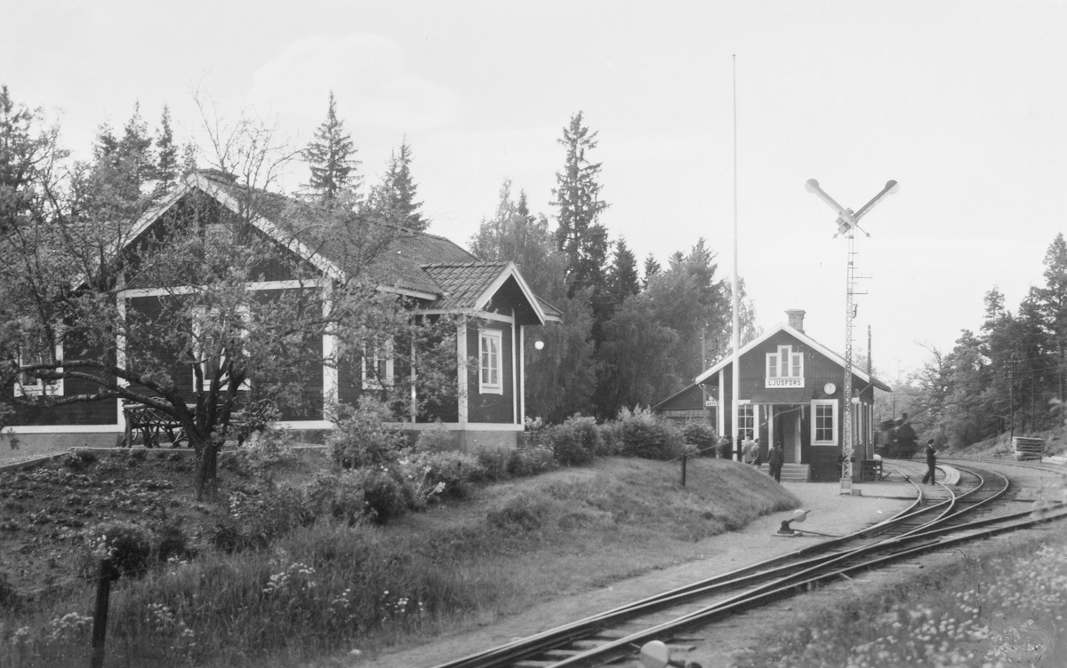 Titel: Ljusfors station med ankommande tåg. Stationen togs i bruk 1885.