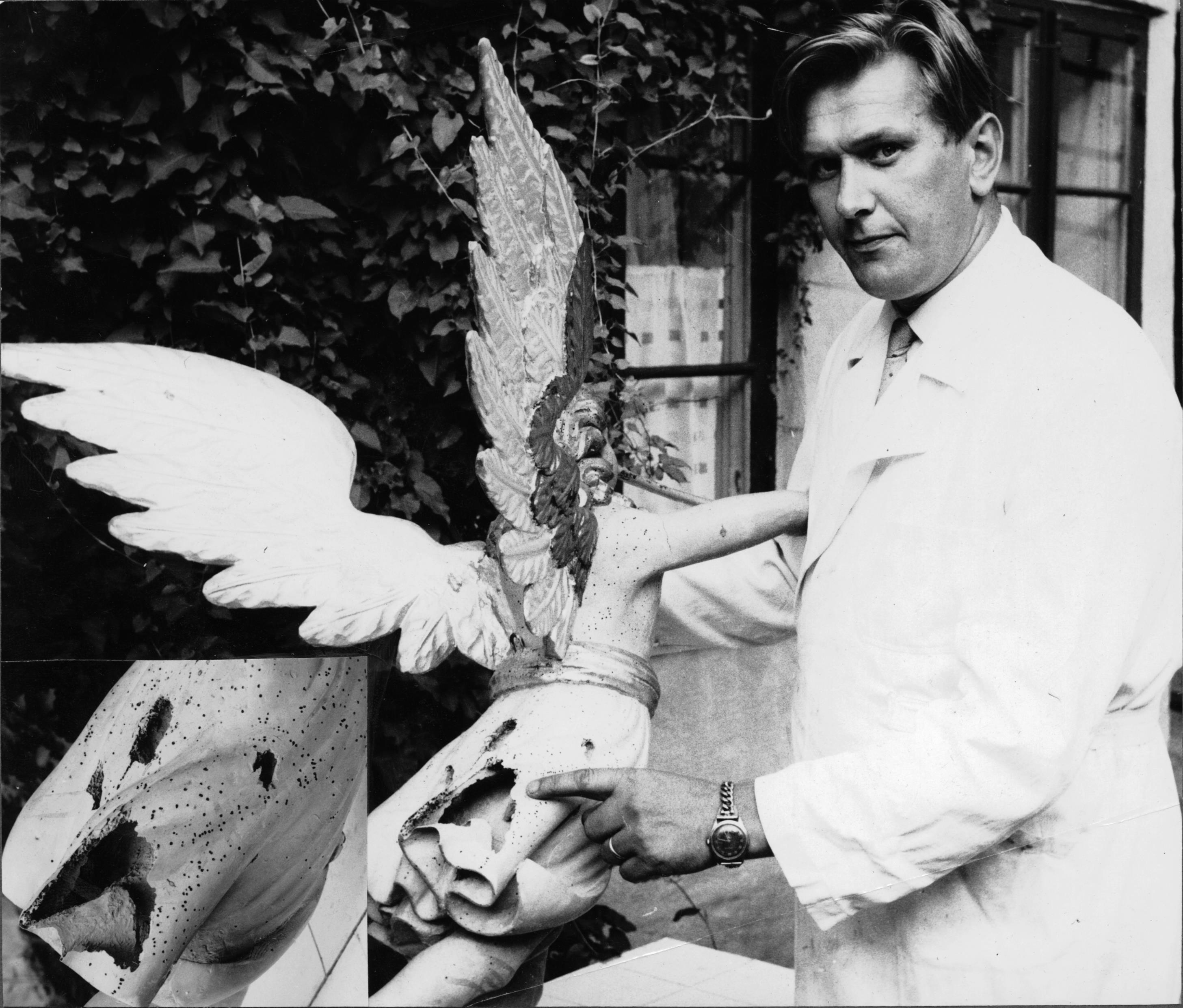 Basunängel, språkband förlorat, ommålad 1909. Från 1700-talet. Hänger i koret. Före behandling med plasträ och bivax.