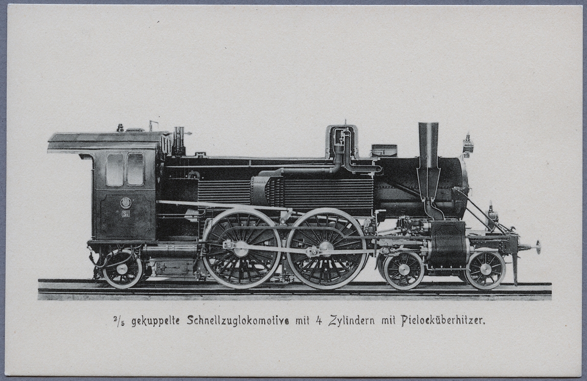 Tyskt ånglok, S5, fyra cylindrar. Genomskuren för att visa uppbyggnaden.