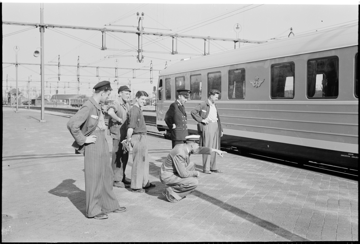 Järnvägspersonal i samtal med verkstadsarbetare.