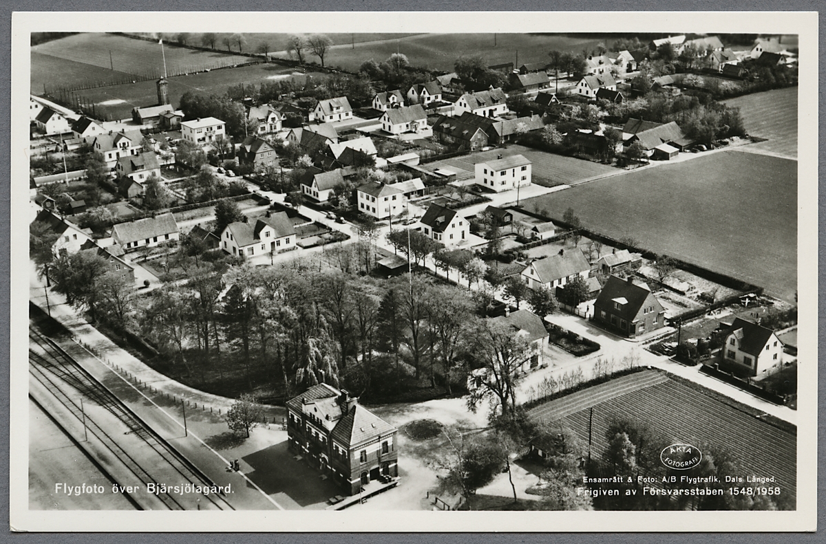 Titel: Flygbild över Bjärsjölagård med stationen i nederkant.
