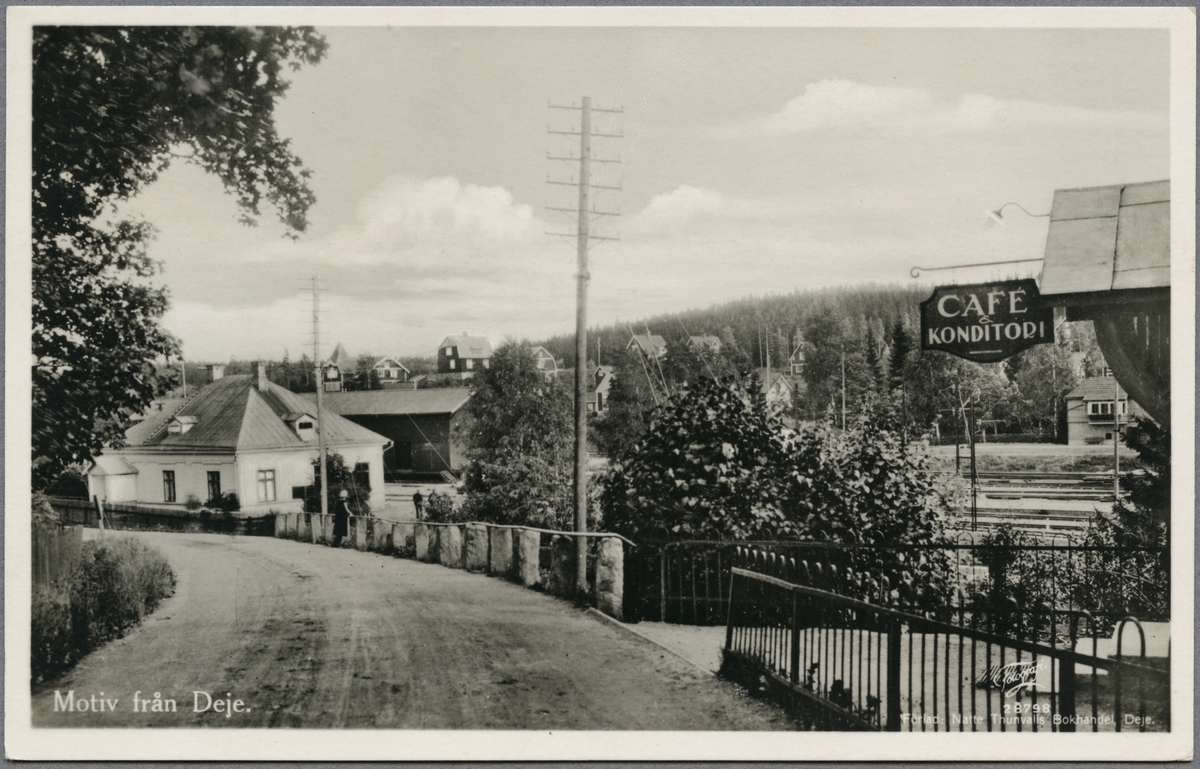 Titel: Vy från Deje. Den vita byggnaden var Karlstad - Munkfors Järnvägs stationshus.
